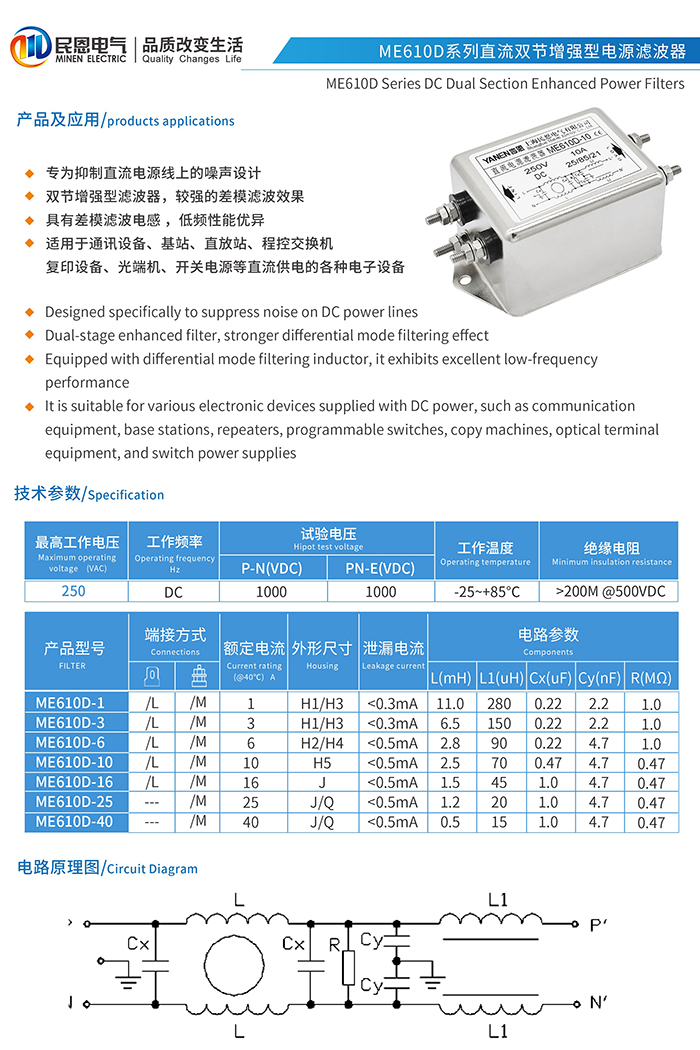 ME610D系列双节增强型直流电源滤波器