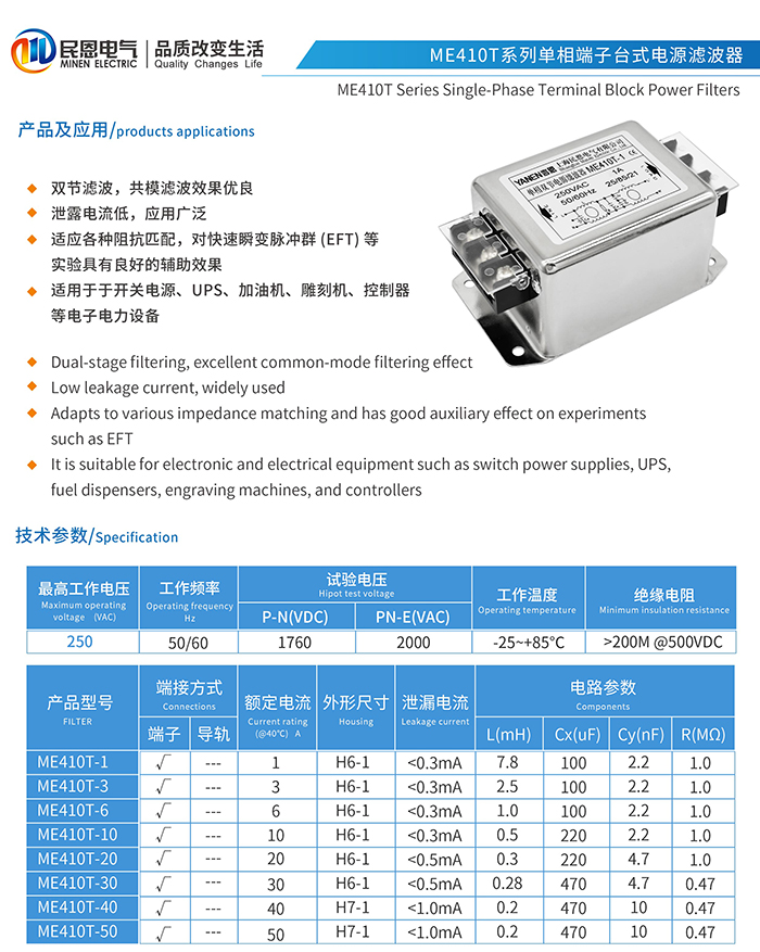ME410T系列单相端子台式电源滤波器